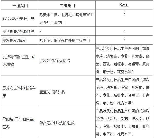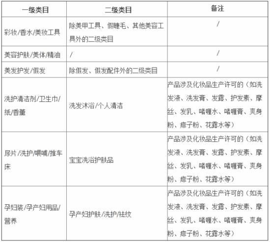 注:1、“彩妆/香水/美妆工具”、“美容护肤/美体/精油”、“美发护发/假发”类目,育发类、染发类、烫发类、脱毛类、美乳类、健美类、除臭类、祛斑类、防晒类九大特殊功效产品暂不招商。